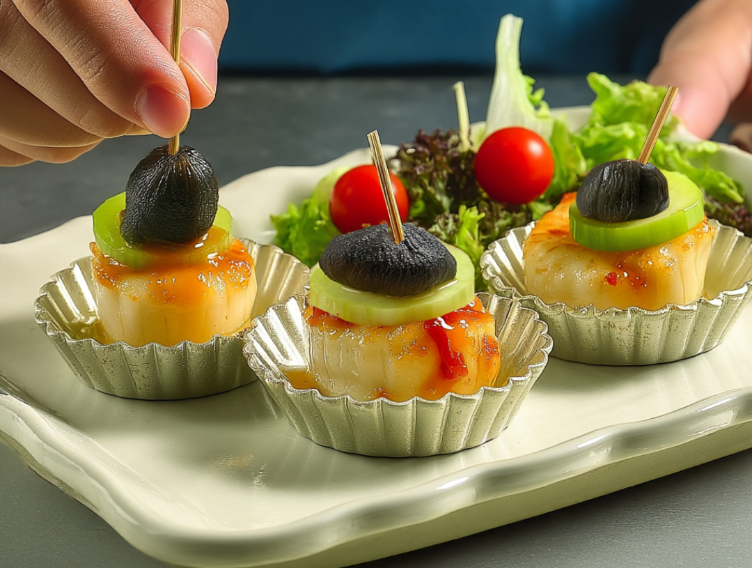Elevate your appetizer experience with these exquisite Black Garlic Scallop Skewers. Plump, sweet scallops are perfectly seared on skewers, allowing their natural oceanic sweetness to shine. They are then infused with the deep, mellow, and slightly sweet umami of fermented black garlic, creating a sophisticated and unforgettable flavor.